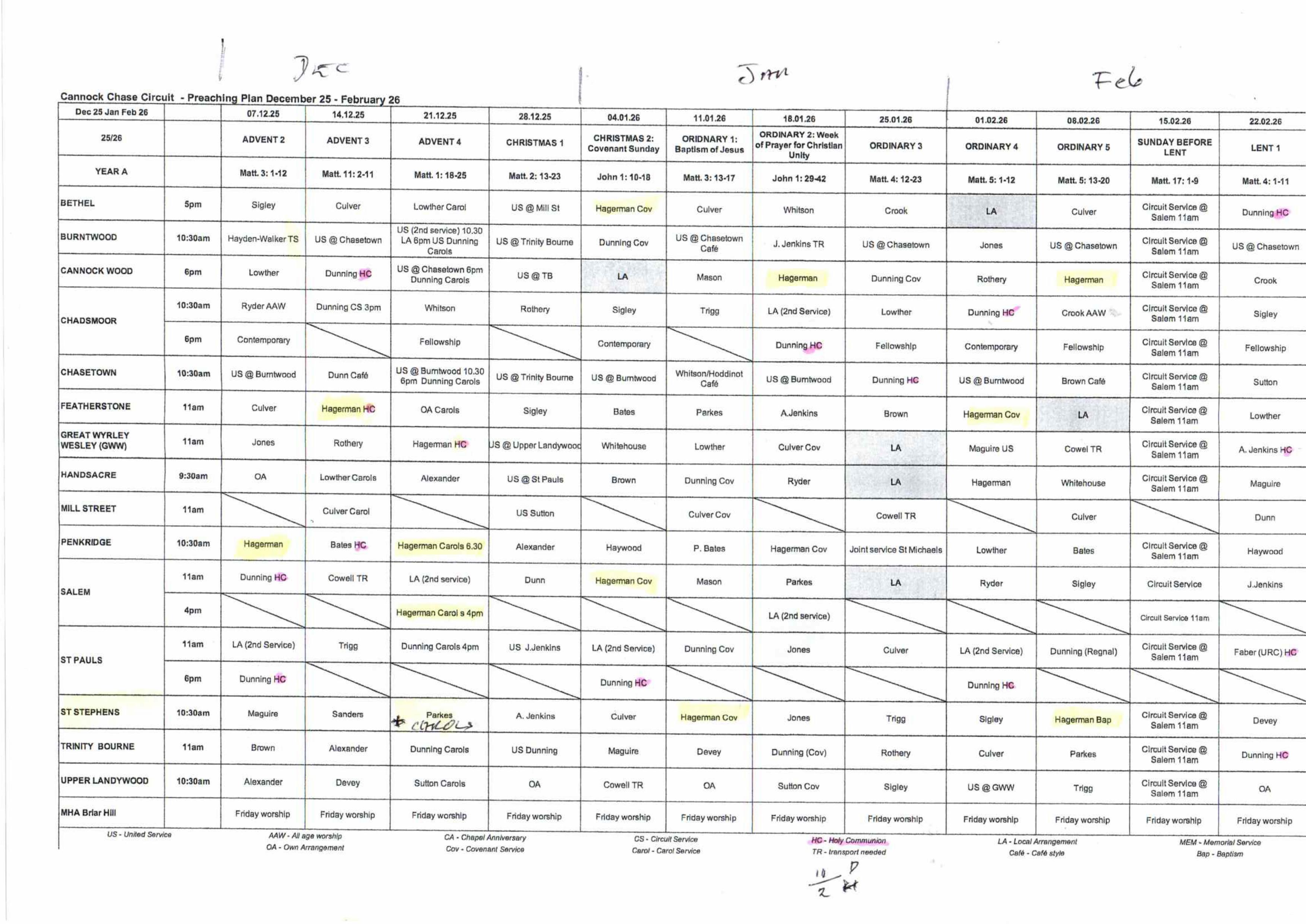 For Local Arrangements the name given in brackets is the person coordinating the service.